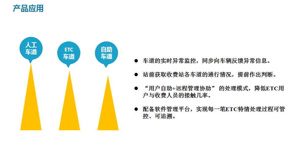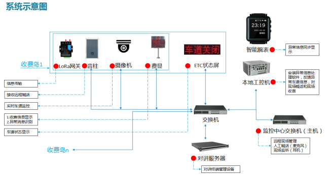 該系統(tǒng)由費額顯示系統(tǒng)、語音提示系統(tǒng)、無線通信系統(tǒng)、車道狀態(tài)屏、車道引流屏共同組成。當收費車道出現(xiàn)異常,管理人員通過“智能腕表”同步接受異常提示,費額顯示器、車道狀態(tài)屏顯示異常信息,同步到收費站前的車道引流屏提醒車輛收費車道通行情況,防止車輛持續(xù)涌入導致?lián)矶隆?/p>